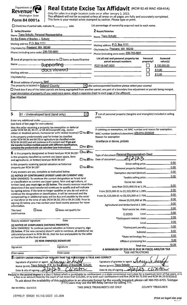 | 1 | 02/02/2023 | PRD | Personal Representatives Deed | SCHULTZ, BRADLEY J | SCHULTZ, TRACY | | | $0.00 | 55820 | 4556583 |
