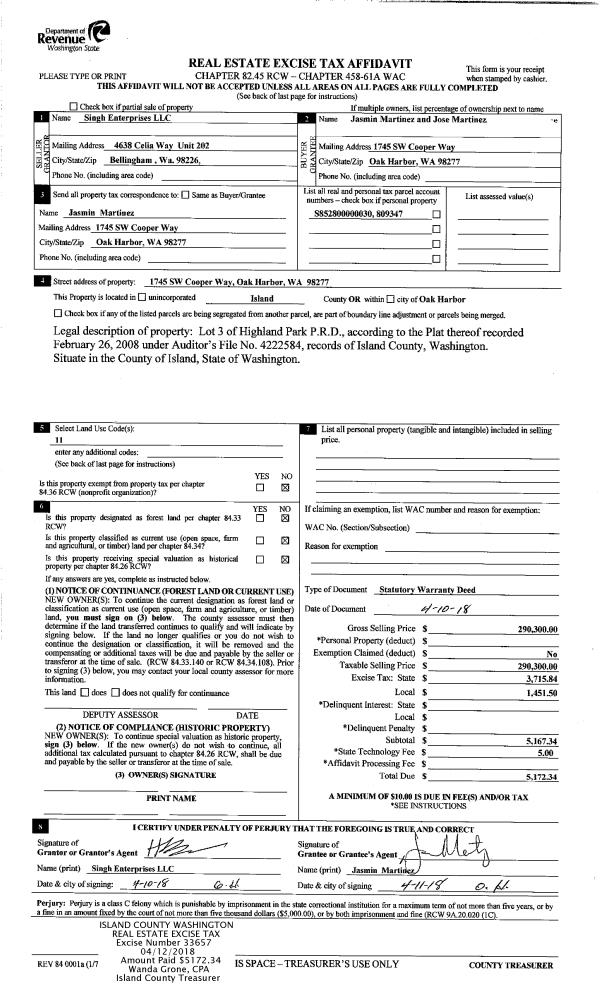 | 3 | 04/10/2018 | WD | Warranty Deed | SINGH ENTERPRISES, LLC | MARTINEZ, JASMIN | | | $290,300.00 | 33657 | 4442523 |
