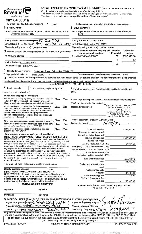 | Mailing Address: | ANDREW J SKINNER II 300 AZALEA PL OAK HARBOR, WA 98277 | % Ownership: | 100.0000000000% |