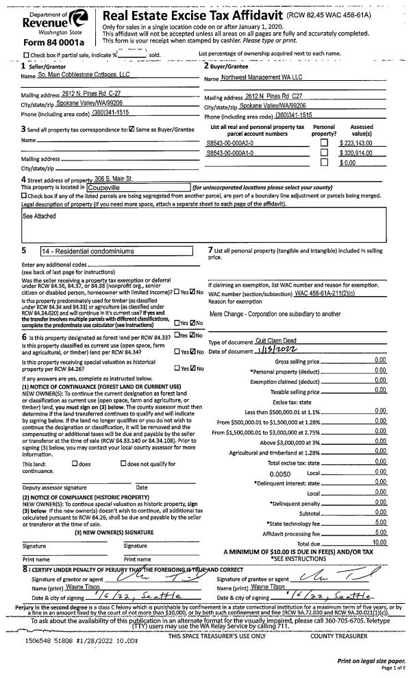 | 1 | 01/13/2022 | QCD | Quit Claim Deed | SO MAIN COBBLESTONE COTTAGES LLC | NORTHWEST MANAGEMENT WA, LLC | | | $0.00 | 51808 | 7538771 |