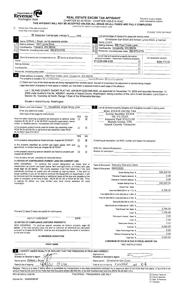 | Mailing Address: | AMBER LYNNE ELLIOTT 486 PLUM CREEK LN COUPEVILLE, WA 98239 | % Ownership: | 100.0000000000% |