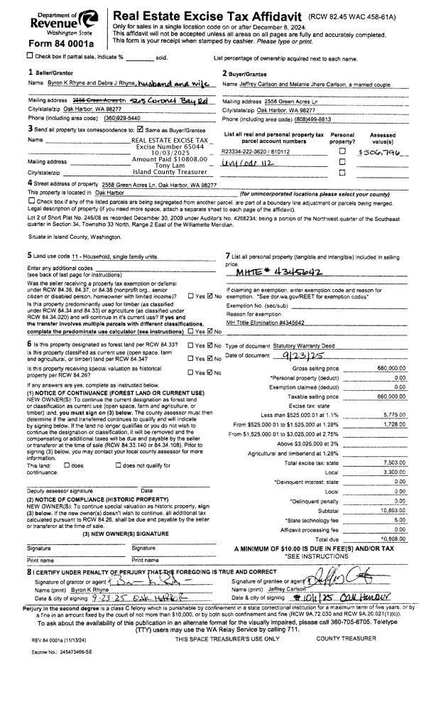 | Mailing Address: | DEBRA J RHYNE 2558 GREEN ACRES LN OAK HARBOR, WA 98277 | % Ownership: | 100.0000000000% |
