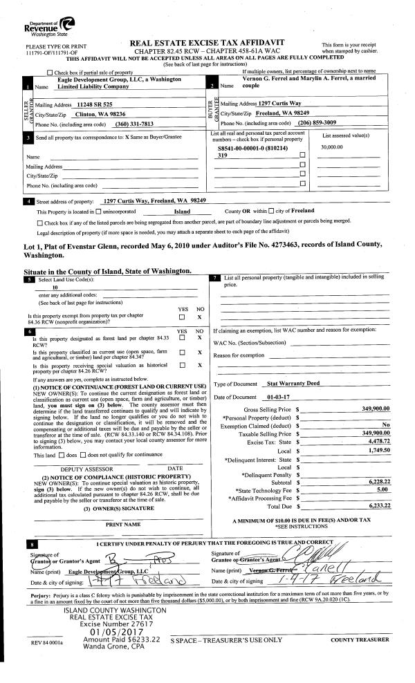 | 1 | 01/03/2017 | WD | Warranty Deed | EAGLE DEVELOPMENT GROUP, LLC | FERREL, VERNON G | | | $349,900.00 | 27617 | 4414607 |