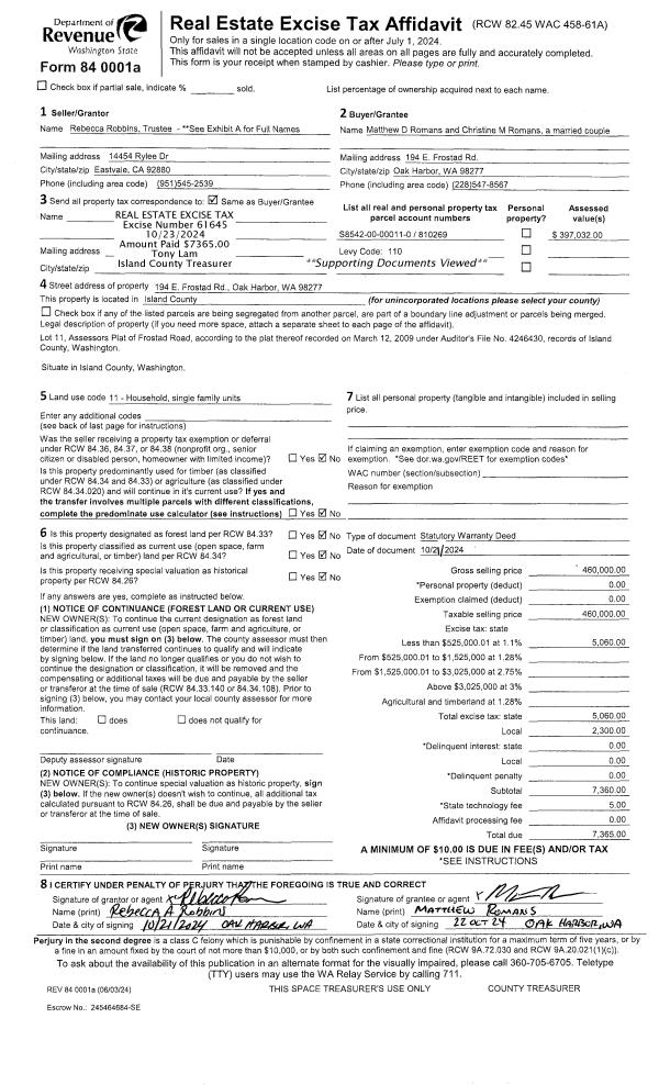 | Mailing Address: | CHRISTINE M ROMANS 194 E FROSTAD RD OAK HARBOR, WA 98277 | % Ownership: | 100.0000000000% |
