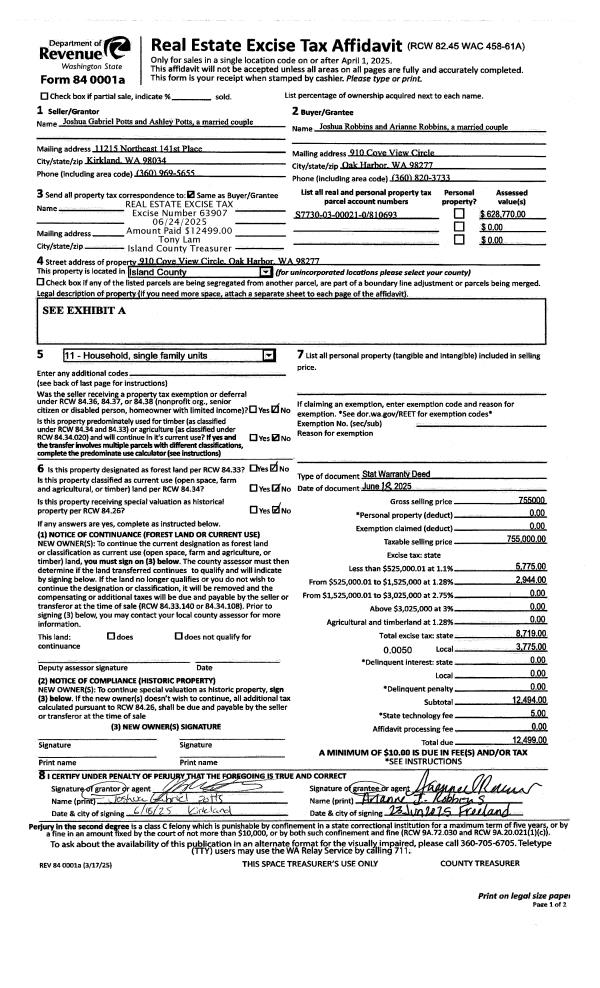 | Mailing Address: | ARIANE ROBBINS 910 COVE VEW CIR OAK HARBOR, WA 98277 | % Ownership: | 100.0000000000% |