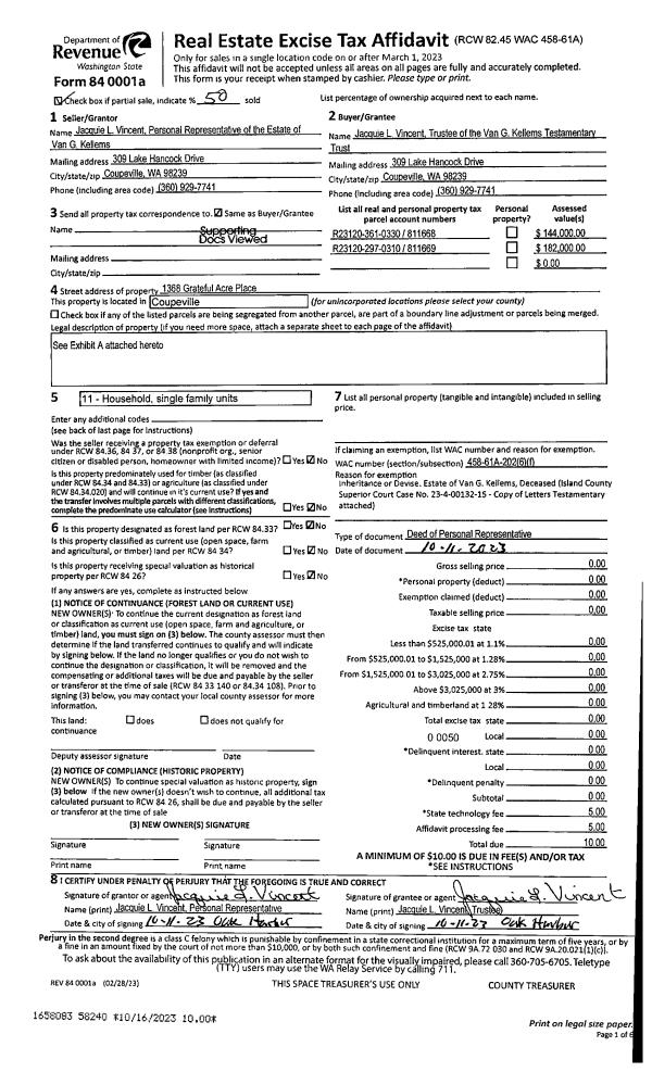 | 1 | 10/11/2023 | PRD | Personal Representatives Deed | KELLEMS, VAN G | VINCENT TTEE, JACQUIE L | | | $0.00 | 58240 | 4565708 |