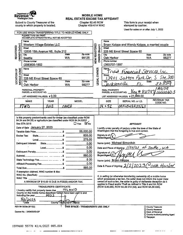 | 1 | 01/27/2023 | MANHOME | Manufactured Home | WESTERN VILLAGE ESTATES, LLC | KOLPPA, BRYAN | | | $55,000.00 | 55778 | |