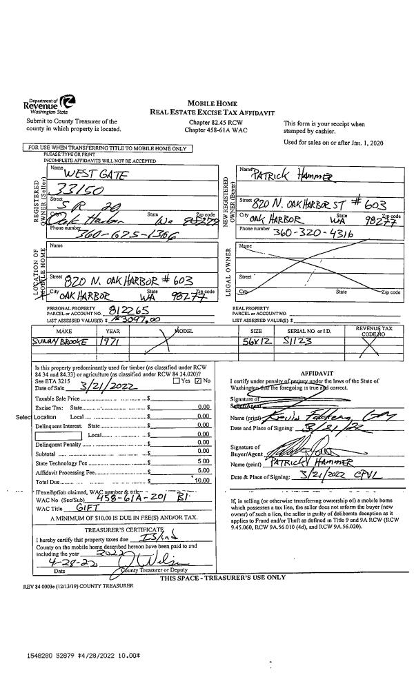 | 1 | 03/21/2022 | MANHOME | Manufactured Home | WESTGATE MOBILE HOMES, INC. | HAMMER, PATRICK | | | $0.00 | 52879 | |