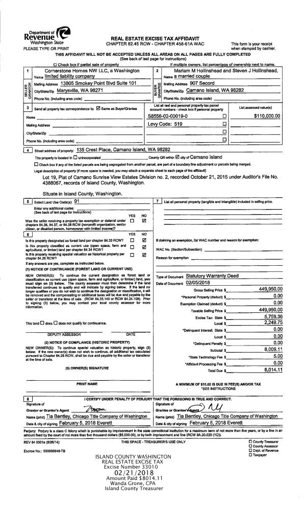| 1 | 02/05/2018 | WD | Warranty Deed | CORNERSTONE HOMES NW LLC | HOLLINSHEAD, MARIAM M | | | $449,950.00 | 33010 | 4439530 |