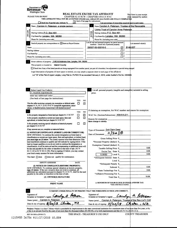 | 1 | 11/20/2018 | QCD | Quit Claim Deed | PETERSON, CAROLYN A | PETERSON TTEE, CAROLYN A | | | $0.00 | 36756 | 4455508 |