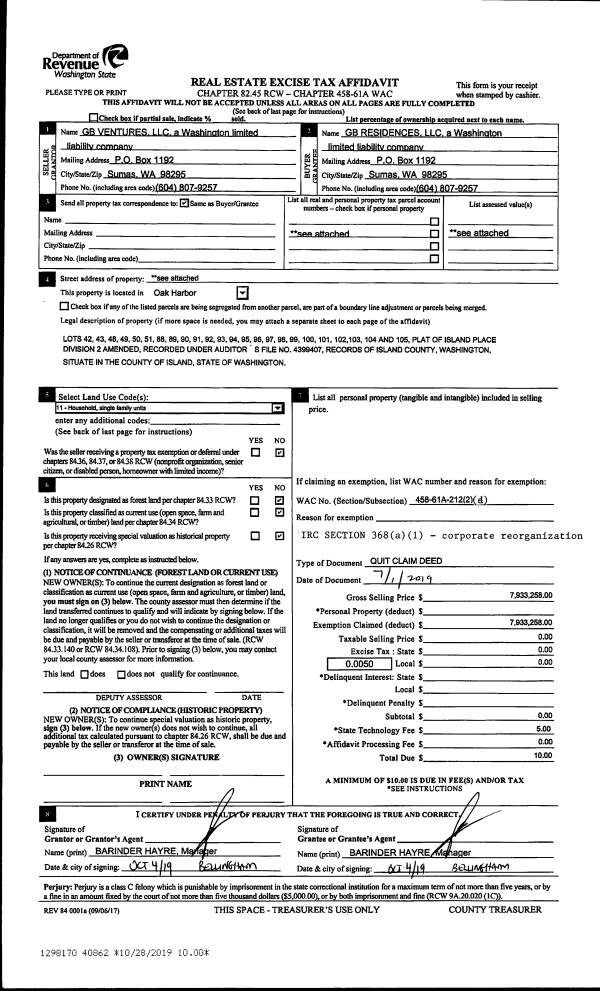 | 1 | 07/01/2019 | QCD | Quit Claim Deed | GB VENTURES L L C | GB RESIDENCES, LLC | | | $0.00 | 40862 | 4474256 |