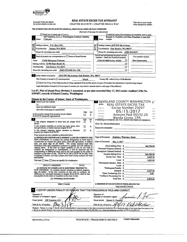 | 1 | 05/02/2017 | WD | Warranty Deed | GB VENTURES L L C | FAUSTINO, RONNIE G | | | $366,700.00 | 29267 | 4422474 |