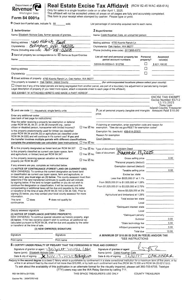 | Mailing Address: | ELIZABETH NICHOLE CATE 4750 KOONTZ RANCH LN OAK HARBOR, WA 98277 | % Ownership: | 100.0000000000% |