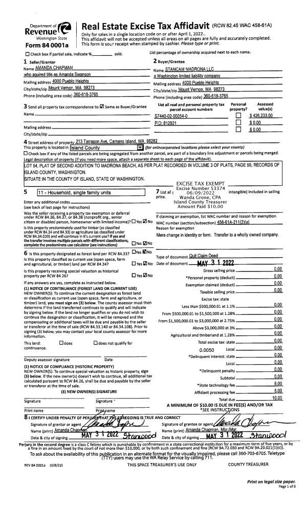 | 2 | 05/31/2022 | QCD | Quit Claim Deed | SWANSON, AMANDA | STANCAM MADRONA, LLC | | | $0.00 | 53374 | 4546364 |