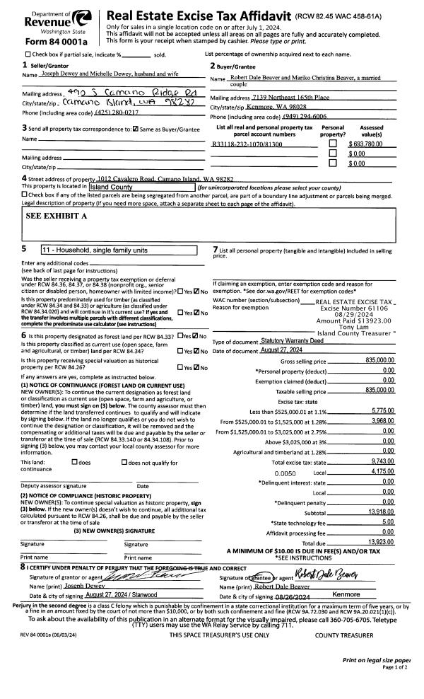 | 1 | 08/27/2024 | WD | Warranty Deed | DEWEY, JOSEPH | BEAVER, ROBERT DALE | | | $835,000.00 | 61106 | 4576411 |