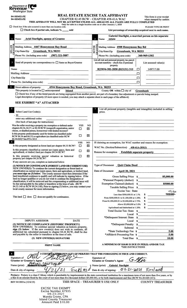 | 1 | 04/20/2021 | QCD | Quit Claim Deed | STARLIGHT, ARIEL | STARLIGHT, GABRIEL | | | $0.00 | 47935 | 4517327 |