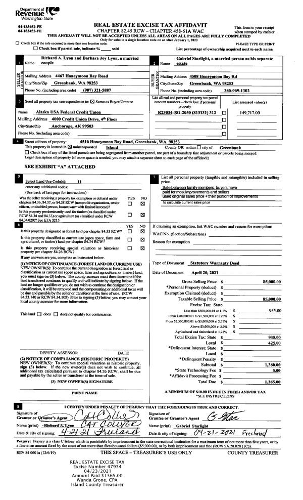 | 2 | 04/20/2021 | WD | Warranty Deed | LYON, RICHARD A | STARLIGHT, GABRIEL | | | $85,000.00 | 47934 | 4517326 |