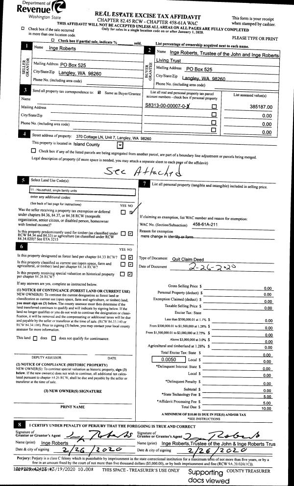 | Mailing Address: | 1621 SW MULBERRY PL, D202 OAK HARBOR, WA 98277 | % Ownership: | 100.0000000000% |