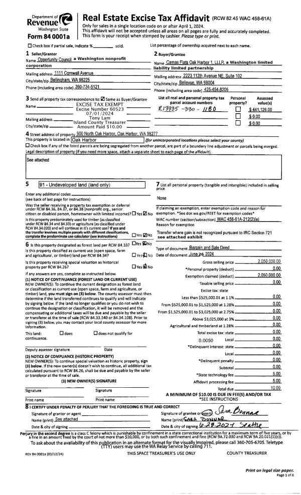 | 1 | 06/26/2024 | BARGSLD | Bargain And Sale Deed | OPPORTUNITY COUNCIL | CAMAS FLATS OAK HARBOR 1, LLLP | | | $0.00 | 60523 | 4574108 |