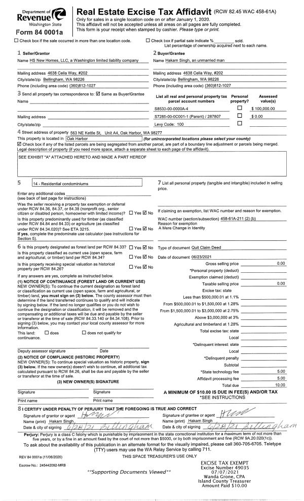 | 2 | 06/23/2021 | QCD | Quit Claim Deed | HS NEW HOMES, LLC | SINGH, HAKAM | | | $0.00 | 49035 | 4523648 |