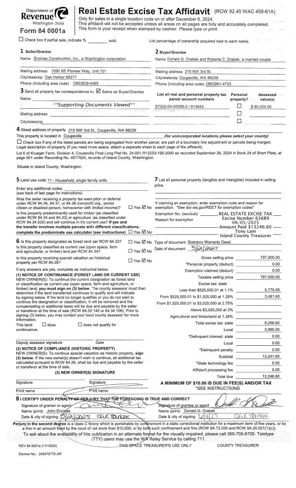 | 2 | 11/04/2024 | WD | Warranty Deed | STUURMANS, CECIL & CHERYL | ENCINAS CONSTRUCTION INC | | | $700,000.00 | 61846 | 4579445 |