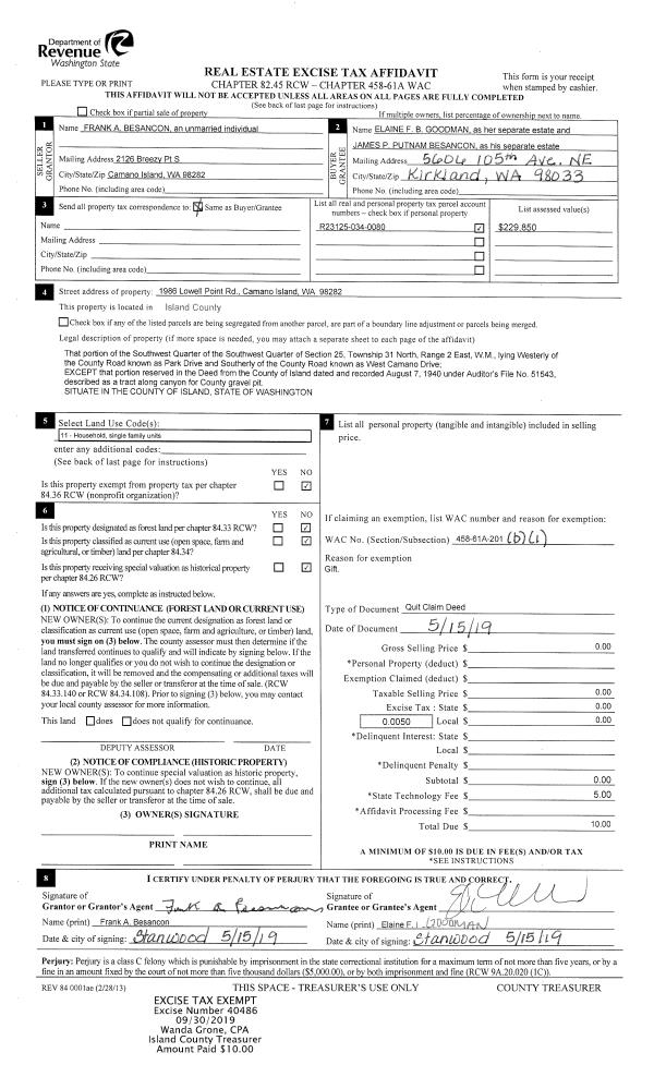 | 2 | 05/15/2019 | QCD | Quit Claim Deed | BESANCON, FRANK A | GOODMAN, ELAINE F B | | | $0.00 | 40486 | 4472390 |
