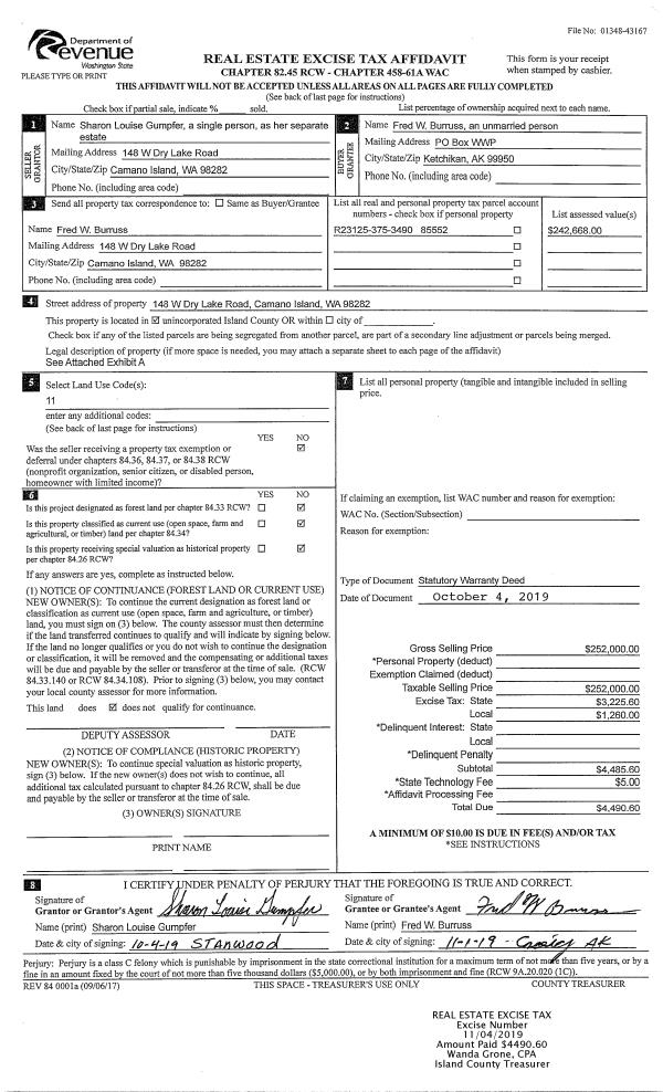 | 2 | 10/04/2019 | WD | Warranty Deed | GUMPFER, GREGORY ALLAN | BURRUSS, FRED W | | | $252,000.00 | 40960 | 4474782 |