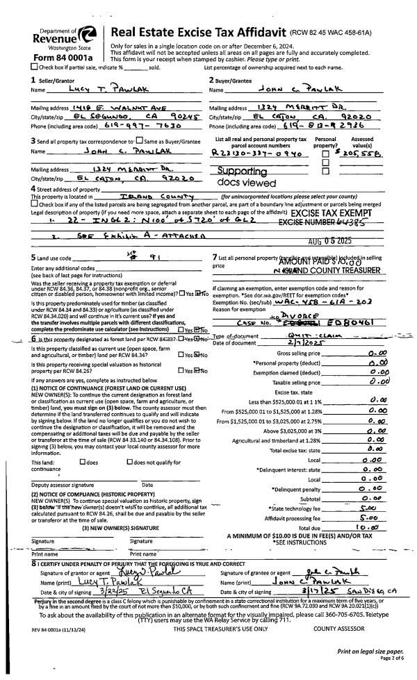 | 1 | 02/07/2025 | QCD | Quit Claim Deed | PAWLAK, LUCY T | PAWLAK, JOHN C | | | $0.00 | 64385 | 4589227 |