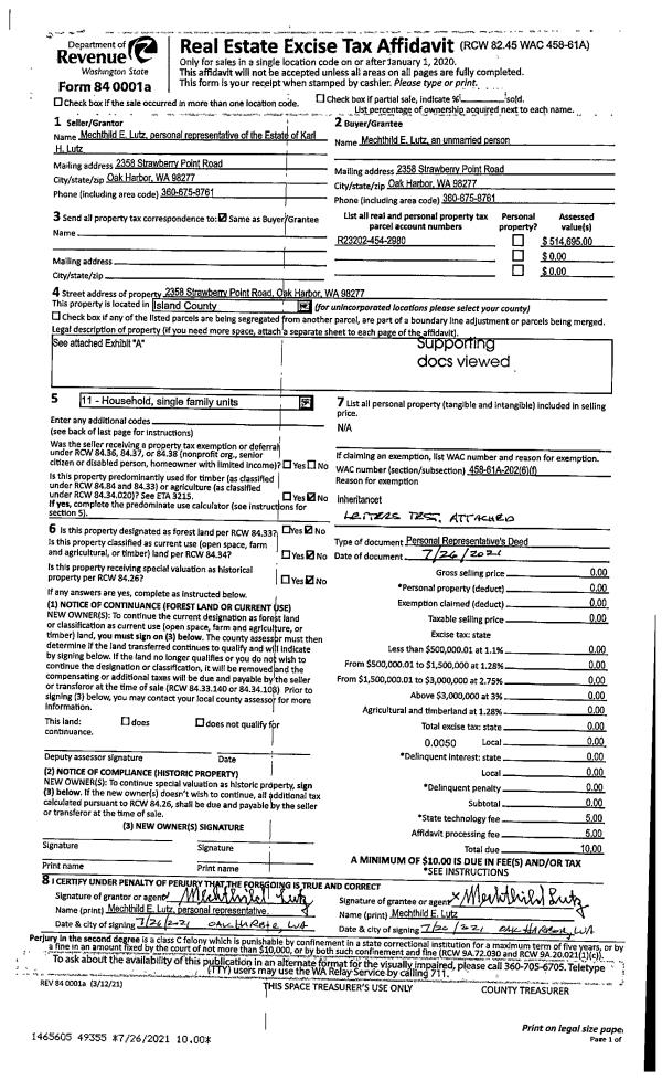 | 1 | 07/26/2021 | PRD | Personal Representatives Deed | LUTZ, KARL H & MECHTHILD | LUTZ, MECHTHILD E | | | $0.00 | 49355 | 4525438 |