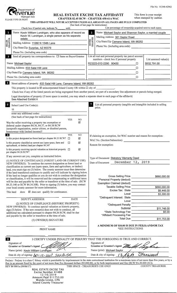 | 2 | 12/12/2019 | WD | Warranty Deed | LUNDRIGAN, KEVIN WILLIAM | SAYLOR, MICHAEL | | | $660,000.00 | 41488 | 4477639 |