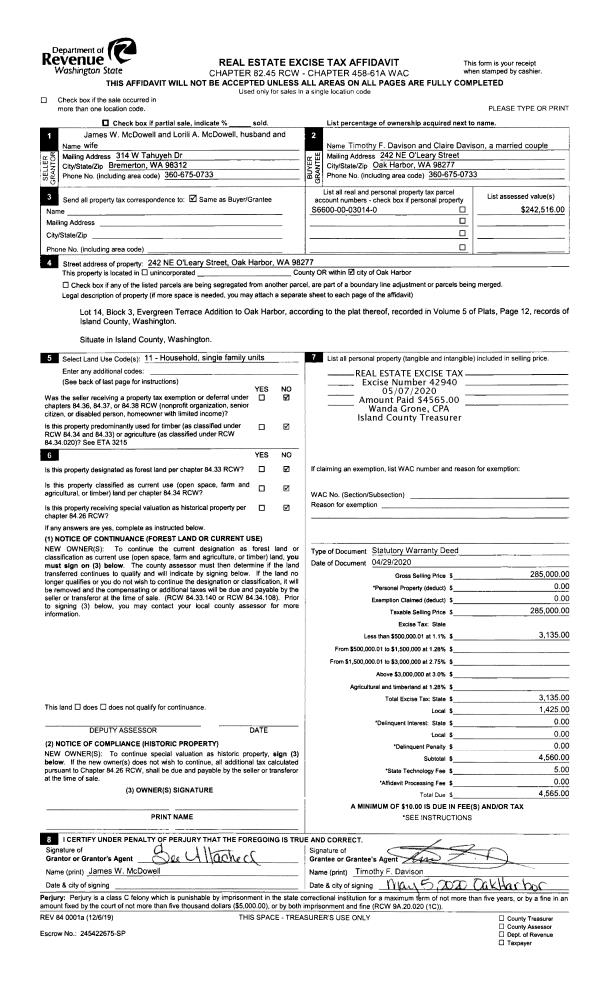 | Mailing Address: | 294 BIG CEDAR LN COUPEVILLE, WA 98239 | % Ownership: | 100.0000000000% |