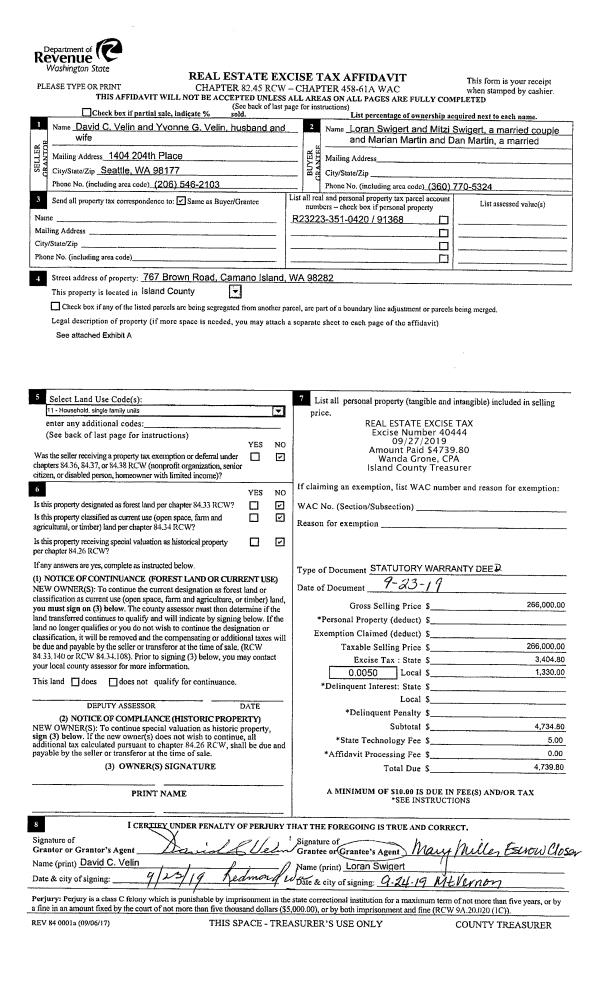 | 1 | 09/23/2019 | WD | Warranty Deed | VELIN, DAVID C | SWIGERT, LORAN | | | $266,000.00 | 40444 | 4472247 |