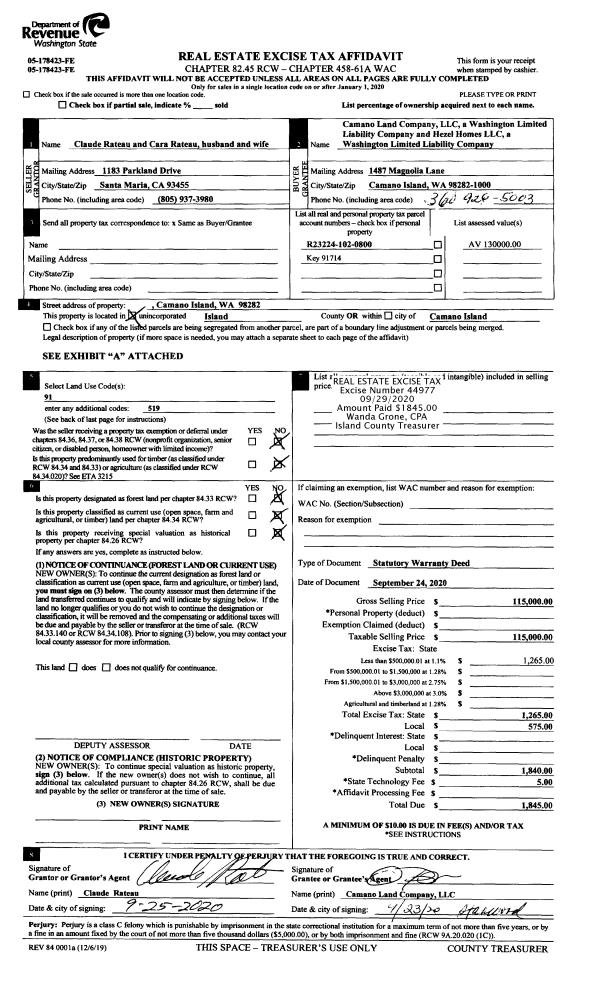 | 2 | 09/24/2020 | WD | Warranty Deed | RATEAU, CLAUDE | CAMANO LAND COMPANY, LLC | | | $115,000.00 | 44977 | 4498003 |