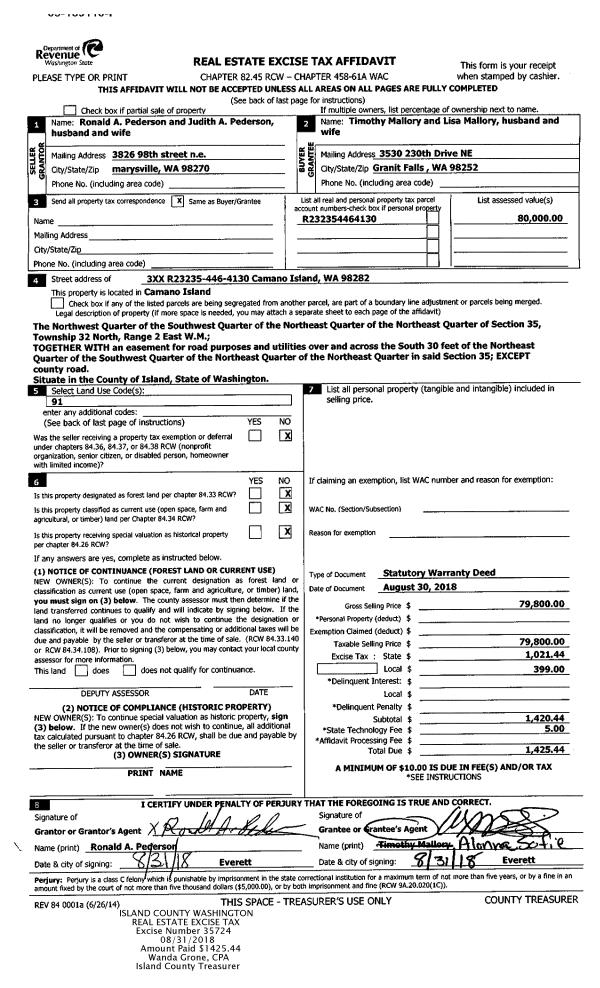 | 2 | 08/30/2018 | WD | Warranty Deed | PEDERSON, RONALD A | MALLORY, TIMOTHY | | | $79,800.00 | 35724 | 4450998 |