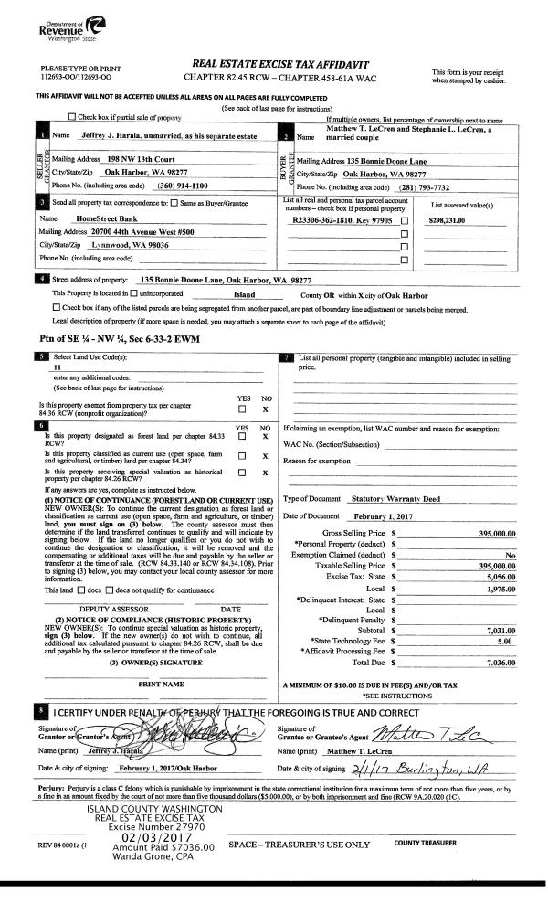 | Mailing Address: | STEPHANIE L LECREN 135 BONNIE DOONE LN OAK HARBOR, WA 98277 | % Ownership: | 100.0000000000% |