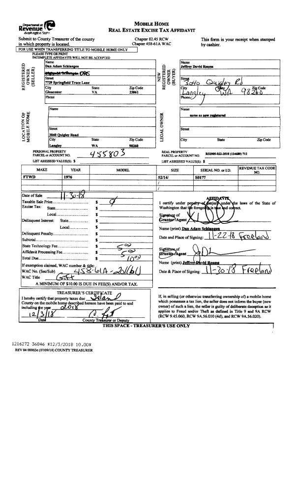 | Mailing Address: | 4156 MORAN BEACH LN OAK HARBOR, WA 98277 | % Ownership: | 100.0000000000% |
