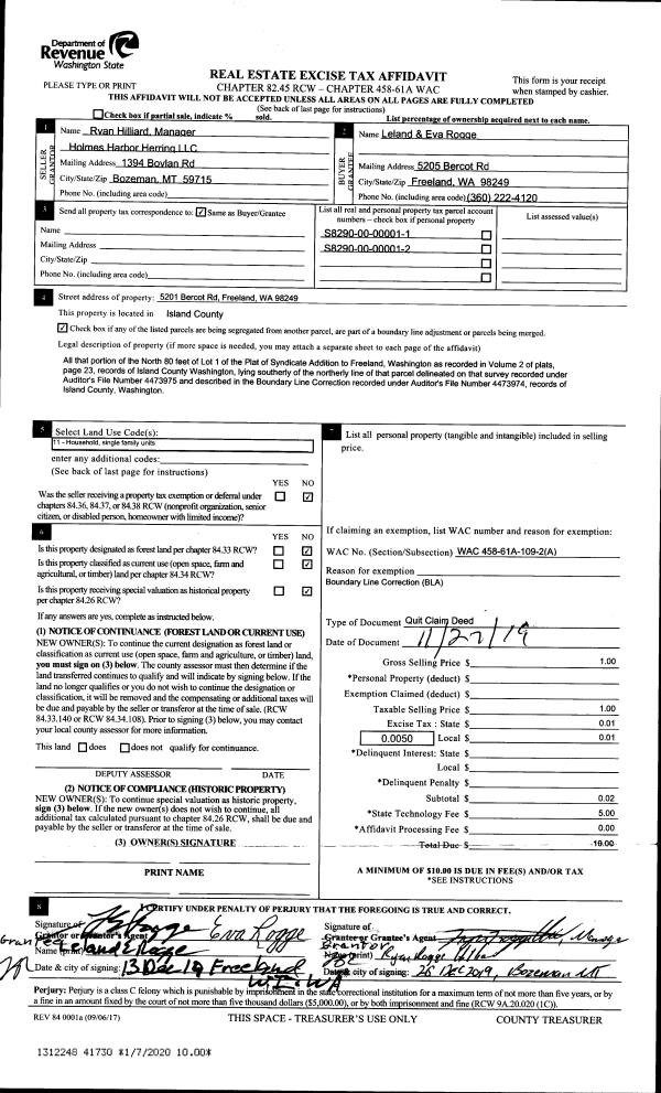 | 2 | 11/21/2019 | EZ | Easement | BORGMAN, DONALD L | PUGET SOUND ENERGY | | | $1,500.00 | 41415 | 4477248 |