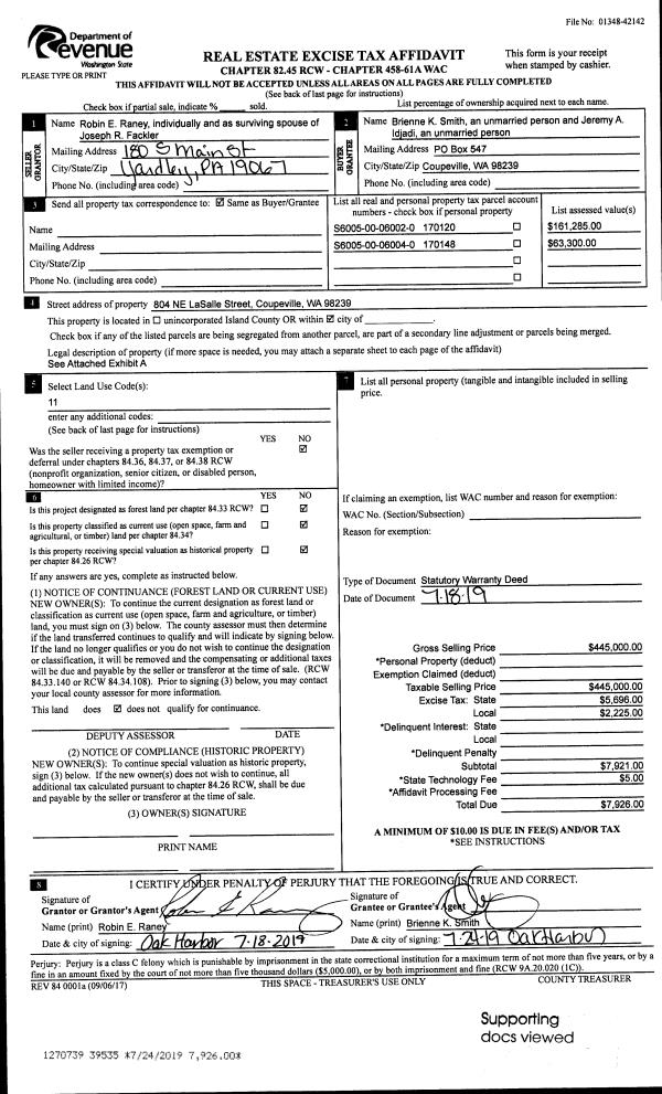 | 1 | 05/17/2019 | BARGSLD | Bargain And Sale Deed | WHIDBEY ANIMALS' IMPROVEMENT FOUNDATION | WHIDBEY CAMANO LAND TRUST | | | $0.00 | 38634 | 4463919 |