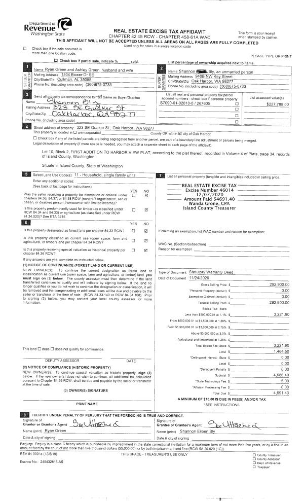 | Mailing Address: | EMILY ANGELL 495 E CRESCENT HARBOR RD OAK HARBOR, WA 98277 | % Ownership: | 100.0000000000% |