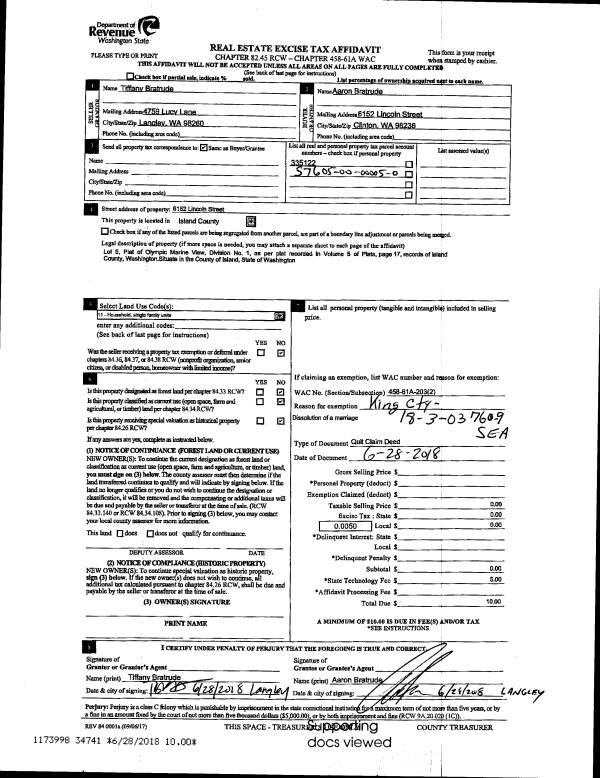 | 1 | 07/24/2018 | QCD | Quit Claim Deed | BETTNER, DONALD E | OAK BAY PROPERTIES, LLC | | | $0.00 | 35167 | 4448700 |