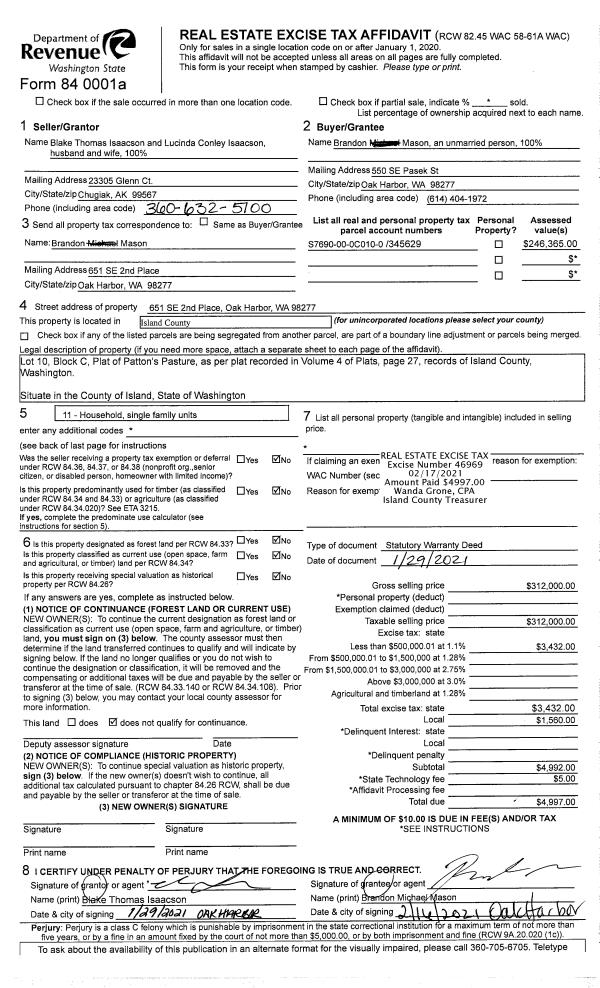 | Mailing Address: | 3840 E THOMAS LN CLINTON, WA 98236 | % Ownership: | 100.0000000000% |