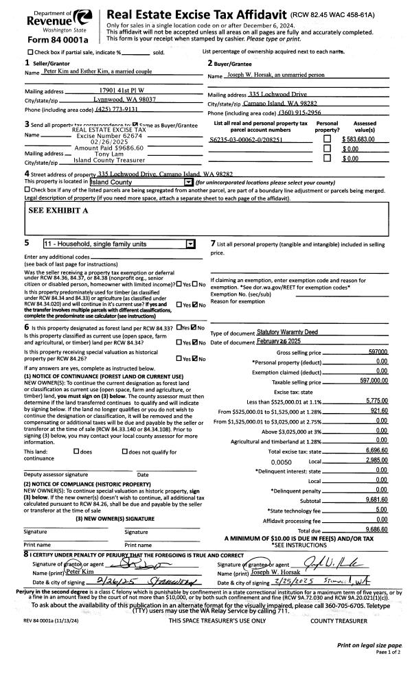 | 1 | 09/30/2024 | EZ | Easement | GULICK, CHRISTOPHER W | WHIDBEY CAMANO LAND TRUST | | | $0.00 | 61455 | 4577785 |