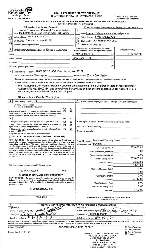 | Mailing Address: | LORELIE REAMS JTWROS 3040 QUIGLEY RD LANGLEY, WA 98260 | % Ownership: | 100.0000000000% |