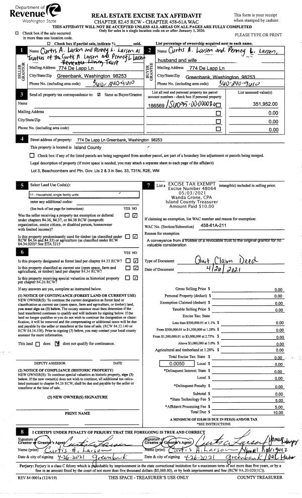 | 1 | 06/17/2025 | WD | Warranty Deed | SPADER, CAROL M | WHIDBEY BEACHSIDE LEGACY LLC | | | $0.00 | 63844 | 4587152 |