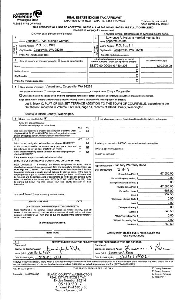 | Mailing Address: | JUSTINA F MACKIE 6147 S HARLEY AVE CLINTON, WA 98236 | % Ownership: | 100.0000000000% |