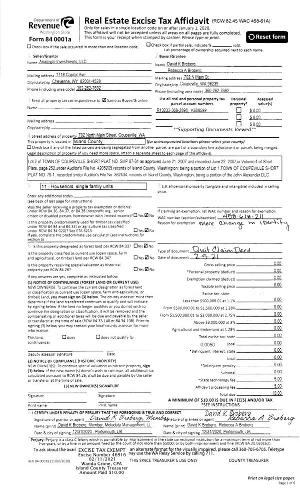 | 1 | 11/20/2008 | QCD | Quit Claim Deed | MCREA, ANDREW R | MACDONALD, ANGUS | | | $250,000.00 | 82999 | 4240374 |