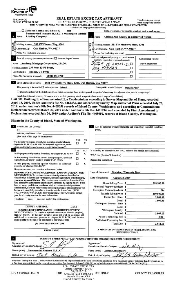 | Mailing Address: | KATHERINE J JIMENEZ 3958 BEAVER CREEK LN CLINTON, WA 98236 | % Ownership: | 100.0000000000% |