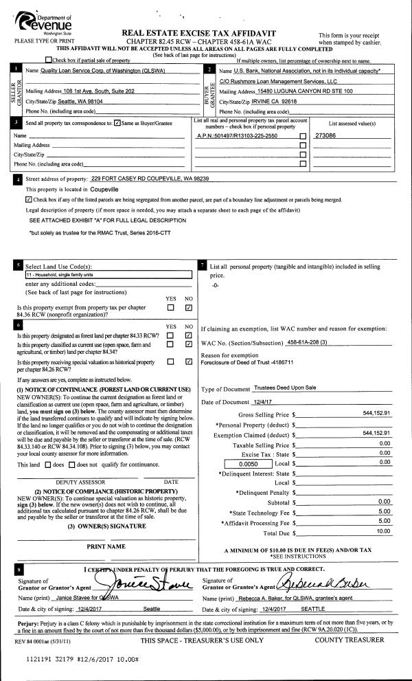 | 1 | 11/08/2017 | TRUSTEED | Trustee's Deed | ISRAEL MORRIS LEE | M&M WHIDBEY, LLC | | | $180,000.00 | 31954 | 4434342 |