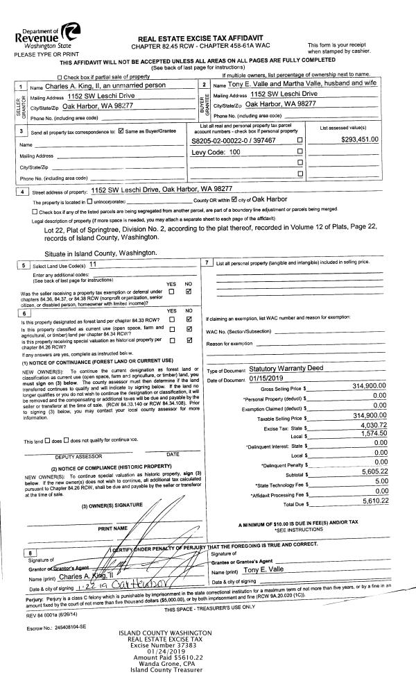 | 1 | 02/09/2019 | EZ | Easement | TAYLOR TRUSTEE, LEWIS CLINTON | PUGET SOUND ENERGY | | | $1,500.00 | 37764 | 4460009 |