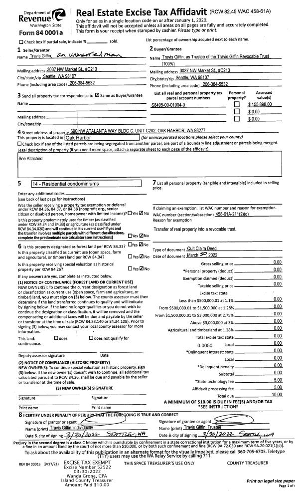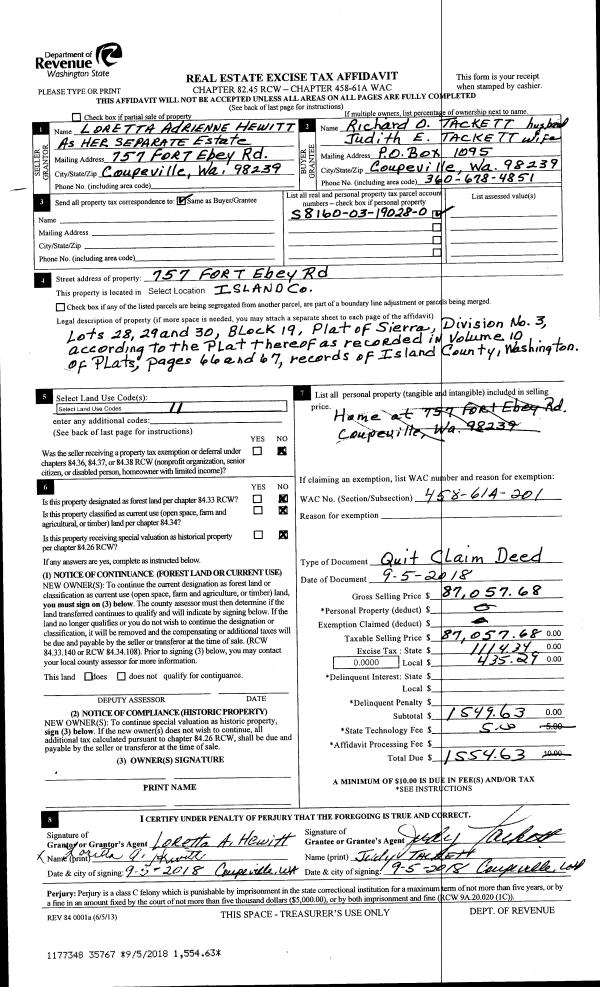 | Mailing Address: | 2937 TILLICUM BEACH CAMANO ISLAND, WA 98282 | % Ownership: | 100.0000000000% |
